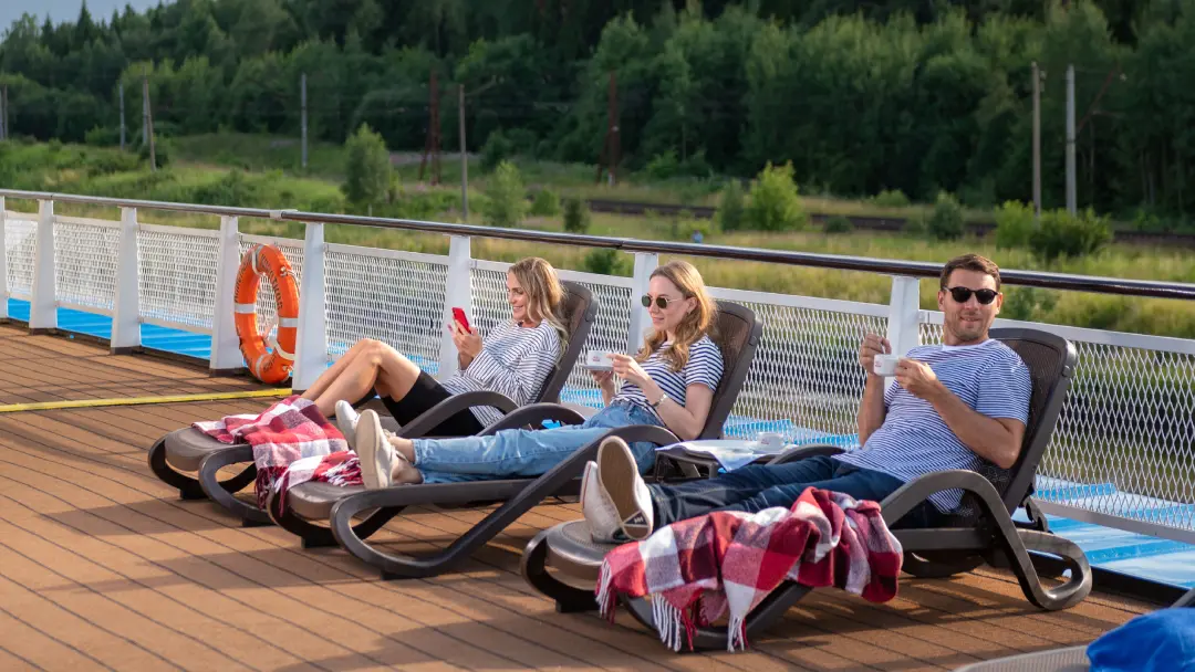 ОТДЫХ НА ПАЛУБЕОткрытые палубы теплохода — излюбленное место отдыха наших гостей. В хорошую погоду утренняя зарядка на солнечной палубе доставит вам особое удовольствие. Именно здесь можно наслаждаться неспешным течением реки и сменяющимися пейзажами, подышать свежим воздухом. |
